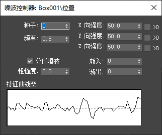 噪波控制器会在一系列帧上产生随机的、基于分形的动画。噪波控制器可设置参数:它们作用于一系列帧上但不使用关键点。