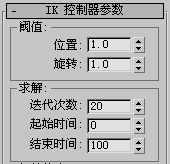 在 IK 控制器参数展卷栏里,指定IK 解决办法的准确度以及此解决方案的框架持续时间。压缩的骨骼,你一般想要一个准确的解决办法保证骨骼完全遵循末端效应器,而没有任何漂移。展卷栏位置的图像内是 0 价值,最少数量的可允许距离(旋转在其 1 的默认价值,旋转末端效应器没在这个例子里使用)。迭代次数设置高,以保证解决办法准确,即使对象递减规模很大。开始和结束时间将跨越动画效果。