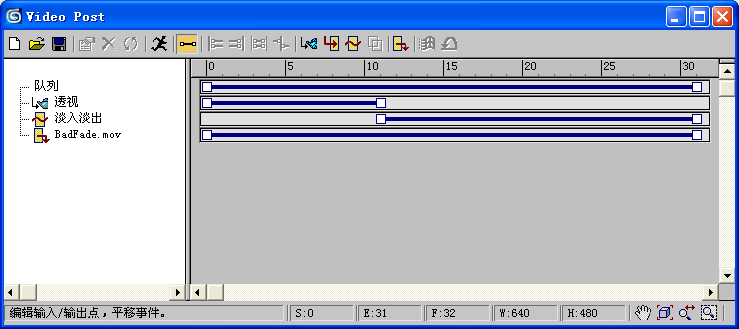 为了修正这个队列,必须确定淡出出现的确切帧数。假如希望在十个帧上淡出场景至黑色。需要将“透视”事件范围栏的右端向右拖动十个帧,以重叠“淡出”事件。