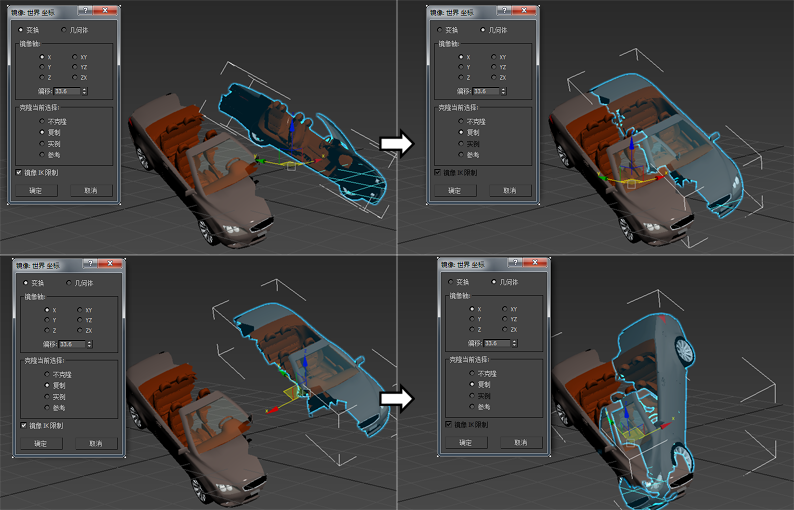 在下图中,首先通过“变换”选项(左上)和“几何体”选项(右上)在世界坐标系中镜像、克隆和偏移汽车。该图的下半部分使用局部坐标系描绘了相同的过程。