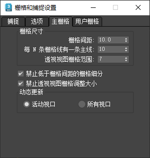 “栅格和捕捉设置”对话框的“主栅格”面板设置主栅格的间距和其他特性。选择有用的主栅格设置可以简化构造过程。主栅格提供用于在场景中创建对象的可视参数。