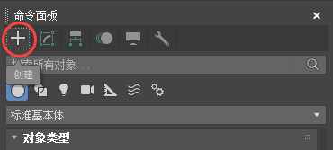 “创建”面板将所创建的对象种类分为 7 个类别。每一个类别有自己的按钮。每一个类别内可能包含几个不同的对象子类别。使用下拉列表可以选择对象子类别,每一类对象都有自己的按钮,单击该按钮即可开始创建。