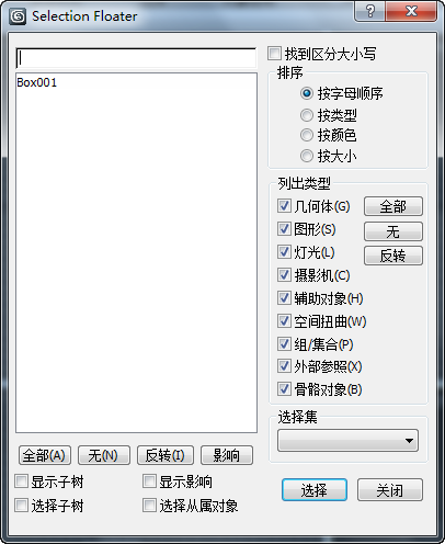 启用此选项并选择了列表窗口中的某一项时,也已选定其所有的从属对象,从属对象包括共享公用修改器(当启用“视图”菜单中的“显示从属对象”时,显示为绿色的相同对象)的实例、参考和对象。