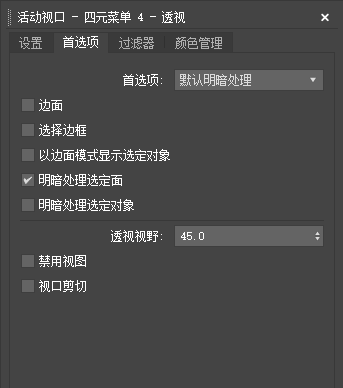 设置“透视”视口的视野角度。默认值为 45.0 度。