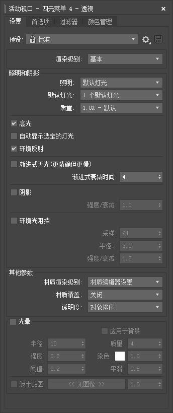 - “标准”和“性能”设置都使用默认照明。在处理 DirectX 明暗器材质时使用 DX 模式。此外,也可以使用齿轮和磁盘按钮保存自定义预设和从文件加载已保存的预设。
