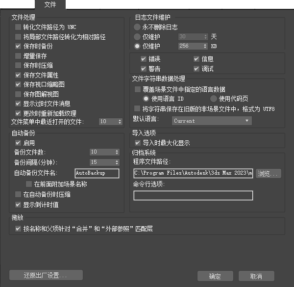 在“首选项设置”对话框的“文件”面板上,可以设置与文件处理相关的选项。您可以选择用于归档的程序并控制日志文件维护选项。并且,自动备份功能可以在设定的时间间隔内自动保存工作。