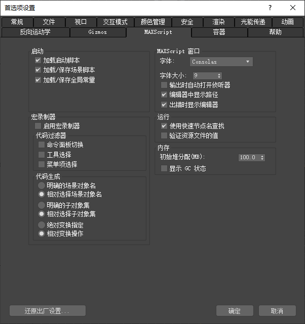 也可以通过编辑 3dsmax.ini 文件的 [MAXScript] 部分来更改这些设置。