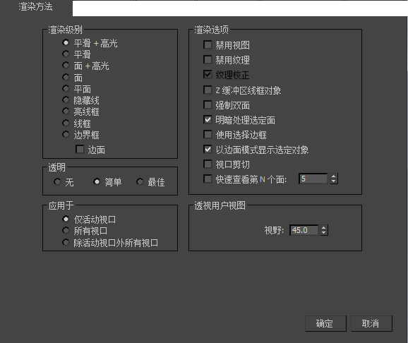 - 打开“视口配置”对话框的“渲染方法”面板。