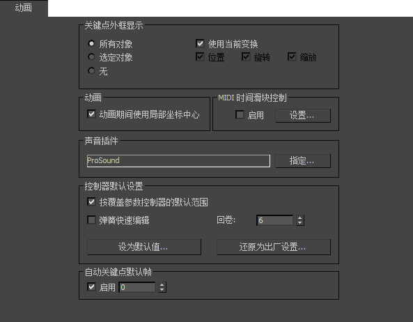 使用“首选项设置”对话框的“动画”面板设置与动画相关的选项。这些选项包括在线框视口中显示的已设置动画的对象、声音插件的指定和控制器默认值。