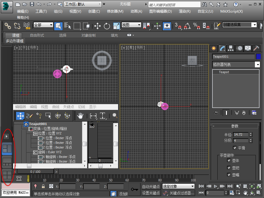 “新建”。 一个新的“轨迹视图”设置将替换视口内容。可以使用此布局同时设置场景动画和编辑您的动画。另请注意,选项卡上图标的上半部分包含水平线,指示它包含扩展视图。