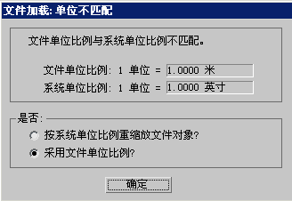 当打开或合并以不同于当前 3ds Max 会话的系统单位设置 保存的文件时,将出现此对话框。默认系统单位设置为“英寸”。