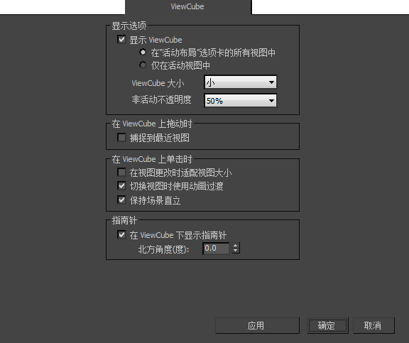 - 启用该选项之后,单击立方体更改视图时,新的视图会旋转到位。禁用该选项之后,新方向会立即捕捉进入视图。后面的模式速度更快,建议有经验的用户使用,但是新用户应使此开关处于打开状态,从而在场景内保持更好的导向。