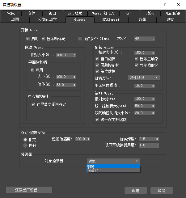 在“首选项设置”对话框的“Gizmo”面板中设置变换 gizmo 的显示和行为方式。