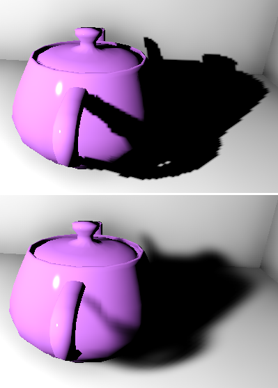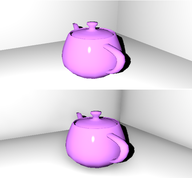 底部:视口“环境光阻挡”处于启用状态,使用默认设置。请注意场景角落和茶壶周围真实的阴影。