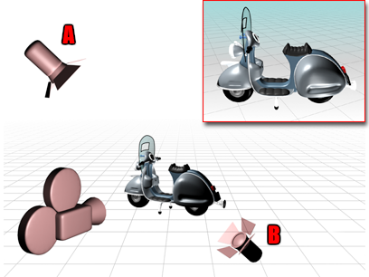 A 为主灯光,位于对象前方、左上侧,B 为辅助灯光,位于对象后方、右下侧。