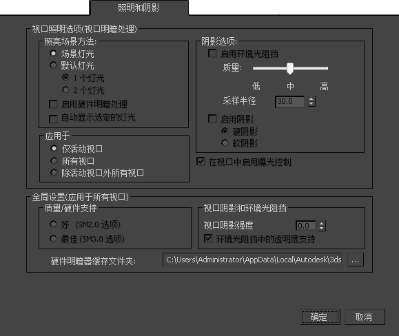 只有在“启用硬件明暗处理”处于启用状态的情况下,此面板中大多数的其余设置才可用。