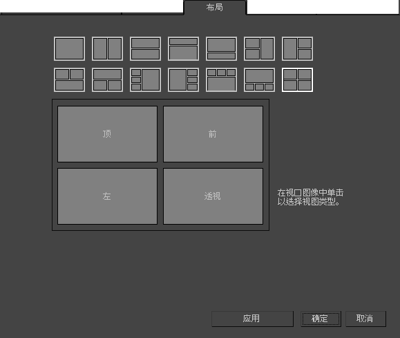 在“视口配置”对话框的“布局”面板上,可以指定视口的划分方法,并向每个视口分配特定类型的视图。