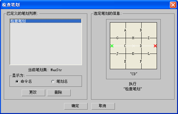 - 在“定义笔划”对话框中单击“确定”可向“查看笔划”对话框中当前高亮显示的命令指定选定的笔划。