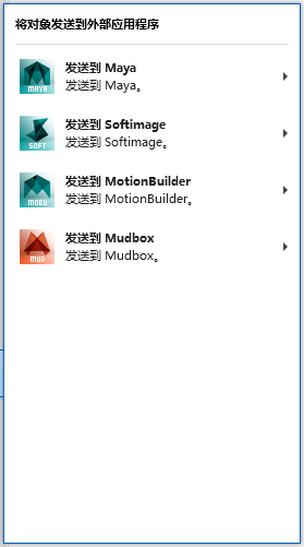 重要: 必须已安装对应版本的其他应用程序才能在“文件”菜单中使用“发送到”命令选项。例如,Maya 2017 和 3ds Max 2017 是等效版本。