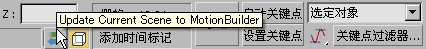 之后,3ds Max 活动会覆盖状态行中的“已连接到 MotionBuilder”消息,但一旦启动连接,状态行右侧的按钮将保持活动状态。可以单击该按钮发送选择:
