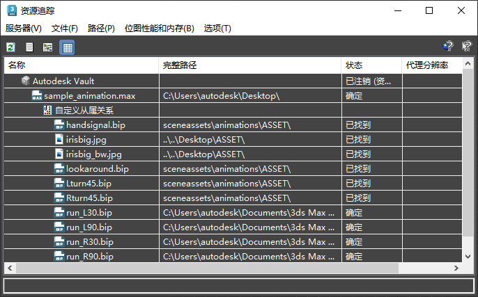 根据当前的设置,“资源追踪”对话框窗口以树视图或表视图的方式列出当前场景的所有资源。所列出的资源包括场景文件、材质中场景所使用的所有图像等、外部参照和光学度文件。默认情况下,如渲染图像等输出文件也出现在窗口列表中;如果需要,可以禁用这些文件的显示。