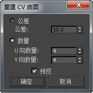 (默认值。)用于更改曲面中的 CV 数。“U 向数量”指定 U 维度中的数量,“V 向数量”指定 V 维度中的数量。这些值默认为已存在于曲面中的数量。