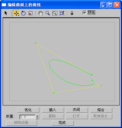 这是一个无模式对话框。当“编辑曲面上的曲线”对话框为打开状态时,可以使用 3ds Max 主窗口。然而,如果选择不同种类的曲线或子对象而不是选择一条曲线,则该对话框将关闭。