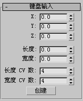 “键盘输入”卷展栏可以通过输入来创建 CV 曲面。使用 Tab 键可以在此卷展栏上的控件之间移动。要单击键盘的“创建”按钮,请在按钮处于活动状态时按下 Enter 键。