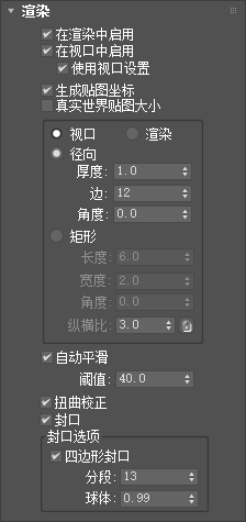 使用此处的控件可以启用和关闭形状的渲染性、指定其在渲染的场景中的厚度,并应用贴图坐标。可以在视口中查看样条线网格。您可以设置渲染参数的动画,例如边数。可以设置视口设置的动画。