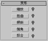 通过“修改”面板的“变形”卷展栏,您可以访问放样变形曲线。“变形”在“创建”面板上不可用。您必须在放样之后打开“修改”面板才能访问“变形”卷展栏,该卷展栏提供以下功能: