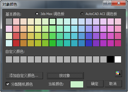 默认情况下,创建对象时,3ds Max 可以随机分配颜色。在“对象颜色”对话框的当前调色板中,可以选择所需的颜色。如果启用“自定义”