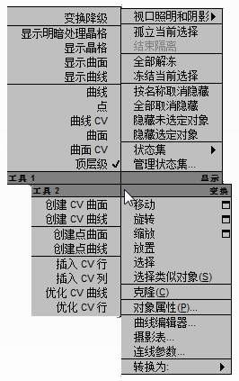 当选中 NURBS 对象,“修改”面板处于活动状态时,四元菜单将显示专用于 NURBS 编辑的两个区域。