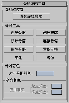 使用“骨骼编辑工具”卷展栏上的控件可以创建并修改骨骼几何体和结构,并为一个或多个骨骼设置骨骼颜色。
