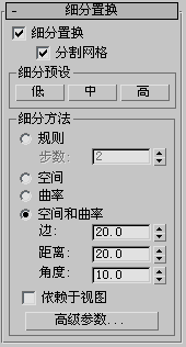 这两个设置决定在启用“细分置换”的情况下 3ds Max 以何种方式应用置换贴图。它们与“曲面近似”卷展栏上用于 NURBS 曲面的“细分”置换相同。