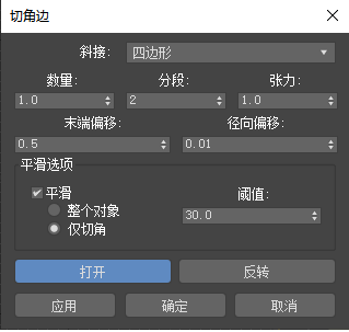 切角在切角实体连同连接边周围创建了新面。或者,可以使用“打开”选项,创建打开的(空的)区域。对于顶点、边和边界,可以按照数值方式设置切角量并切换“打开”选项。“分段”设置仅应用于边和边界。