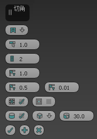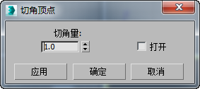 启用“启用小盒控件”时,切角使用小盒界面;禁用“启用小盒控件”时,切角使用标准切角设置对话框。有关使用小盒控件的详细信息,请参见“可编辑多边形设置”主题中的“小盒界面”。