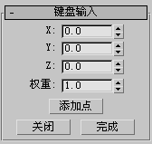 使用“键盘输入”卷展栏可以通过输入创建 NURBS 曲线。使用 Tab 键可以在卷展栏上的控件之间移动。要单击键盘按钮,请在按钮处于活动状态时按下 Enter 键。