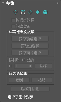 通过“选择”卷展栏顶部的图标,可以指定面选择的方法。在这里单击一个按钮与在修改器堆栈中选择一个子对象类型效果相同。再次单击该按钮将其禁用并返回到对象选择层级。