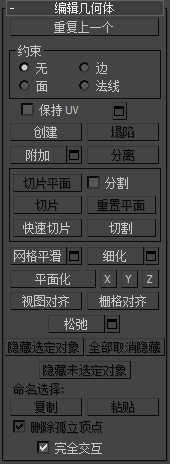 “编辑几何体”卷展栏提供了用于在顶(对象)层级或子对象层级更改多边形对象几何体的全局控件。除在以下说明中注明的以外,这些控件在所有层级均相同。