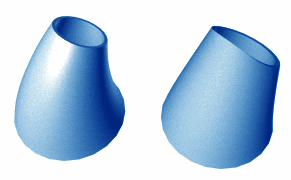 下面的图显示的是,堆栈中的两个修改器,如果执行顺序颠倒过来,那么对象会有什么变化。在左手边的管道,是先应用了一个“锥化”修改器,后应用了一个“弯曲”修改器,在右手边的管道,先应用的是“弯曲”。