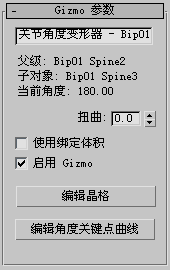 将关节角度或凸出角度变形器添加到蒙皮修改器并在 Gizmos 卷展栏上高亮显示它时,会显示此卷展栏。
