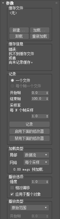 从磁盘上的缓存文件中加载顶点动画到“点缓存”修改器中。如果缓存中的顶点数与对象中的顶点数不匹配,则“缓存信息”组报告错误,并且动画不生效。