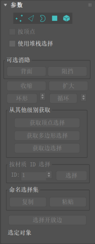 - 在“网格选择”的“参数”卷展栏的底部有一个文本显示,它提供关于当前选择的信息。如果没有子对象选中,或者选中了多个子对象,那么该文本给出选择的数目和类型。如果选中了一个子对象,那么该文本给出选定项的 ID 编号和类型。