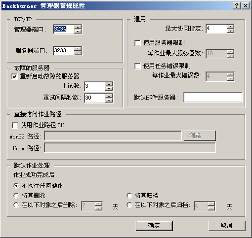 第一次运行管理器时,将会看到“Backburner 管理器常规属性”对话框,如下图所示。