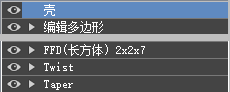 - 在“修改器堆栈”中,启用先前禁用的三个修改器:“FFD”、“扭曲”和“锥化”。