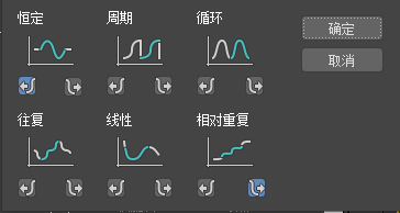 此对话框会针对如何在您创建的关键点范围外继续动画部分提供了各种选项。每个选项都由一个图形按钮表示。在图形中,原始动画由实线轨迹表示,继续动画的效果由虚线轨迹表示。