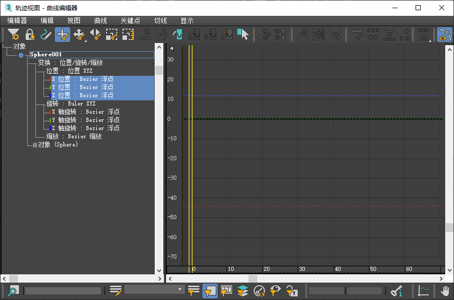 3ds Max 将打开“曲线编辑器”。刚刚创建的球轨迹会显示在左侧,而曲线本身会显示在右侧的曲线窗口中。