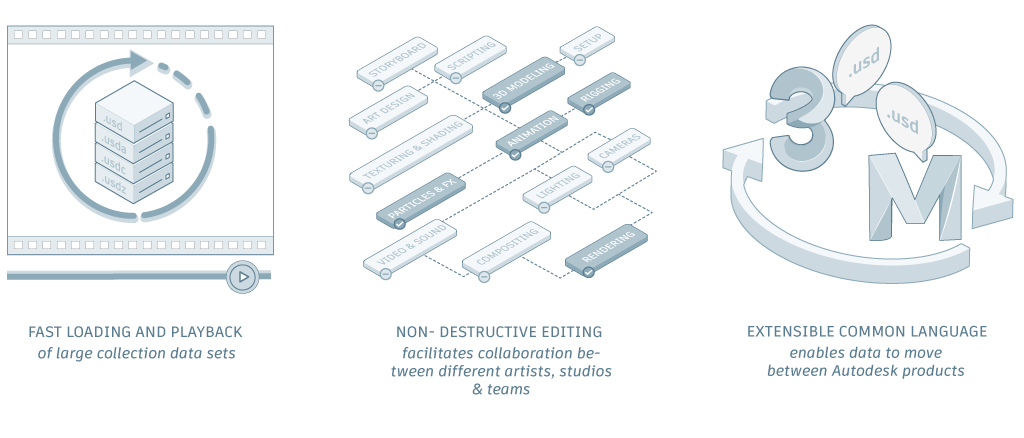The USD for 3ds Max plug-in lets you create and edit USD data, and facilitates collaborations by streamlining data transfer between products (ie. Maya and 3ds Max). By enabling USD data to flow in and out of 3ds Max, this plug-in supports DCC-agnostic pipelines, streamlines workflows, and allows non-linear collaboration between artists.