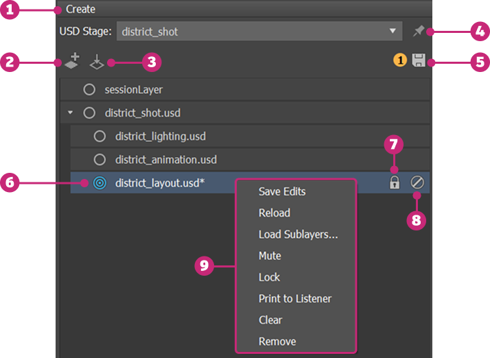 | 8 | Mute a Layer | Click to mute a layer. When a layer is muted, it's ignored by the stage and the contents of the muted layer disappear in the Viewport and Scene Explorer. Muted layers do not participate in value resolution or composition. |