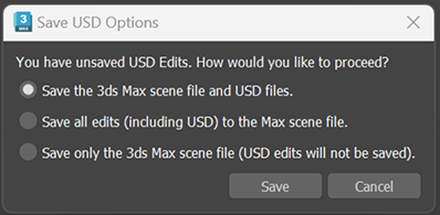 When you save a scene file with edits on USD layers, the Save USD Options dialog appears with three options: